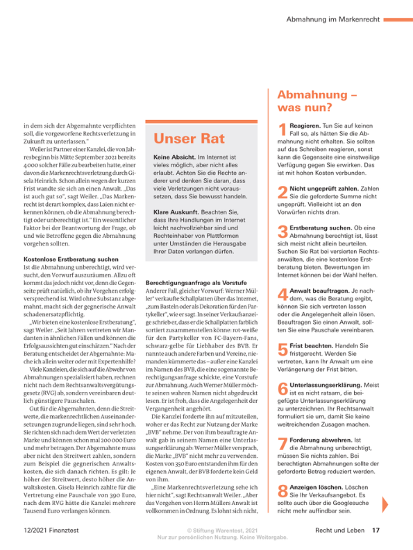 Wir erläutern klar und verständlich, worauf es bei Abmahnungen, einstweiligen Verfügungen oder Klagen im Wettbewerbs-, Urheber- und Markenrecht ankommt.
